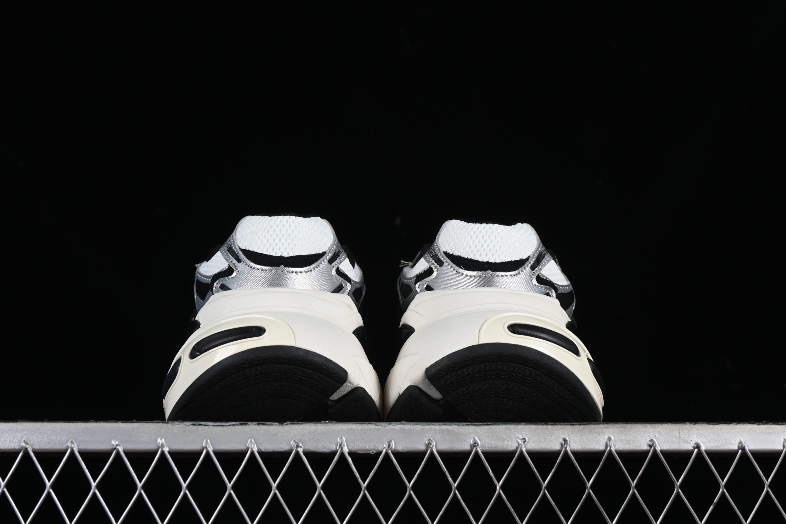 Сочетание белого, черного и мерцающего серебристого металлика создает яркий, динамичный образ, который притягивает взгляды. Детали из сетки и синтетических акцентов подчеркивают спортивный стиль.