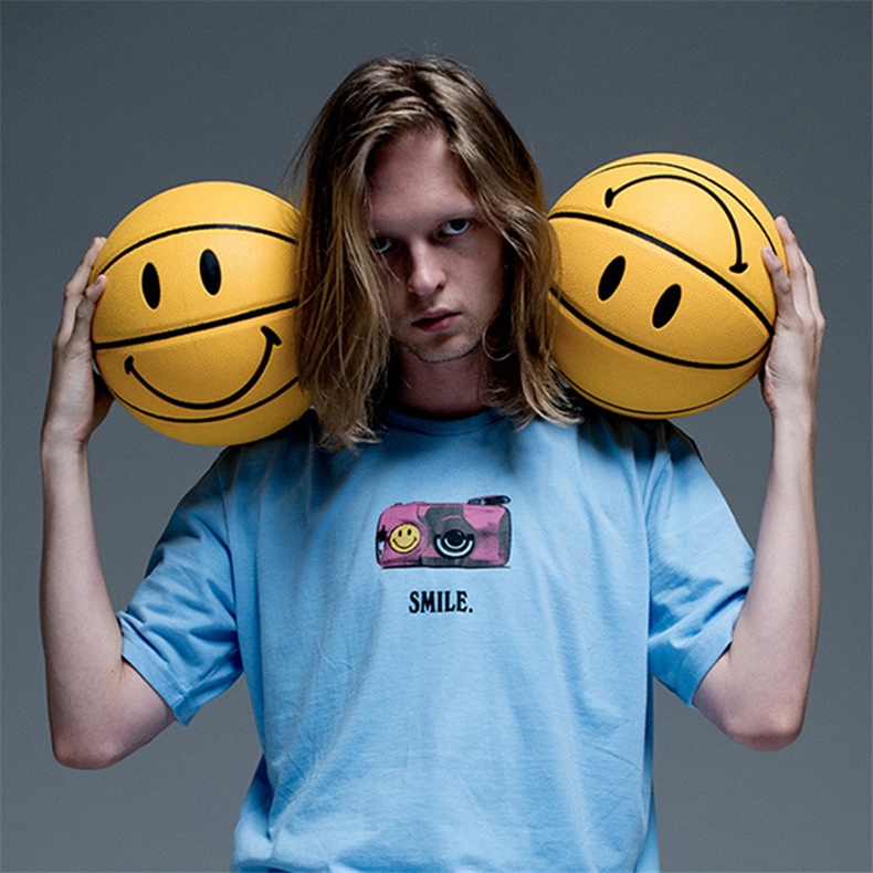 Яркий желто‑черный баскетбольный мяч с крупным рисунком улыбающегося смайла, который делает его заметным и стильным аксессуаром как для игры, так и для фотосессий.